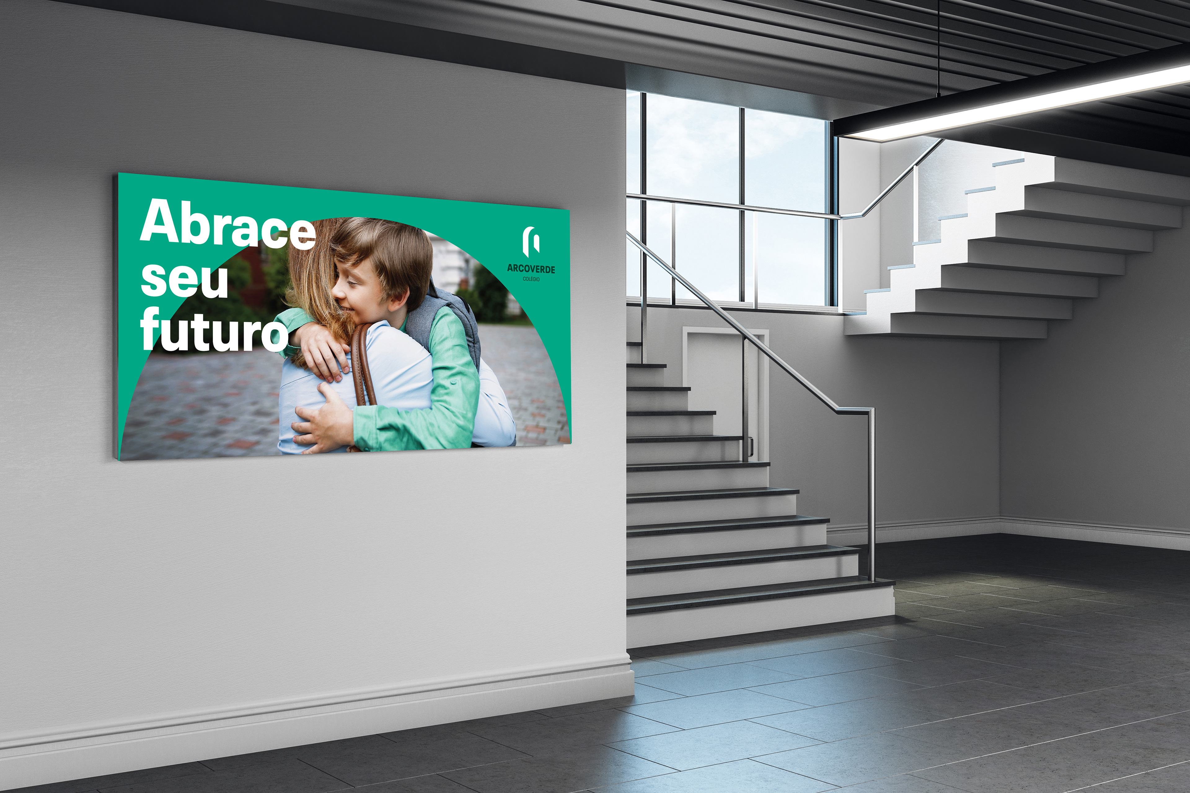 A logo foi criada para atrair o olhar para esta passagem, este portal de transformação que é a educação.